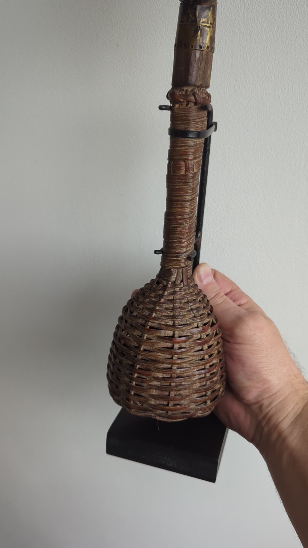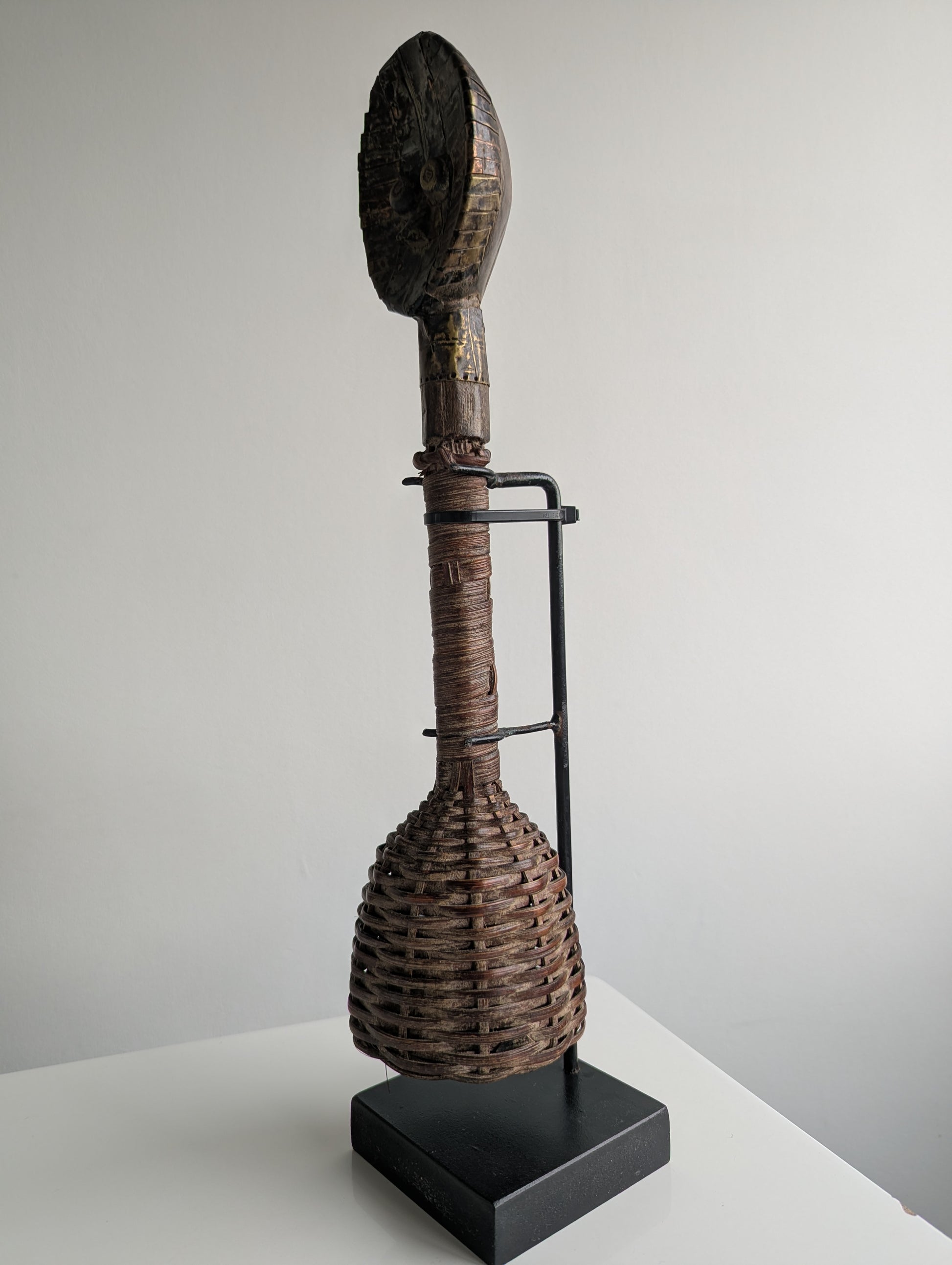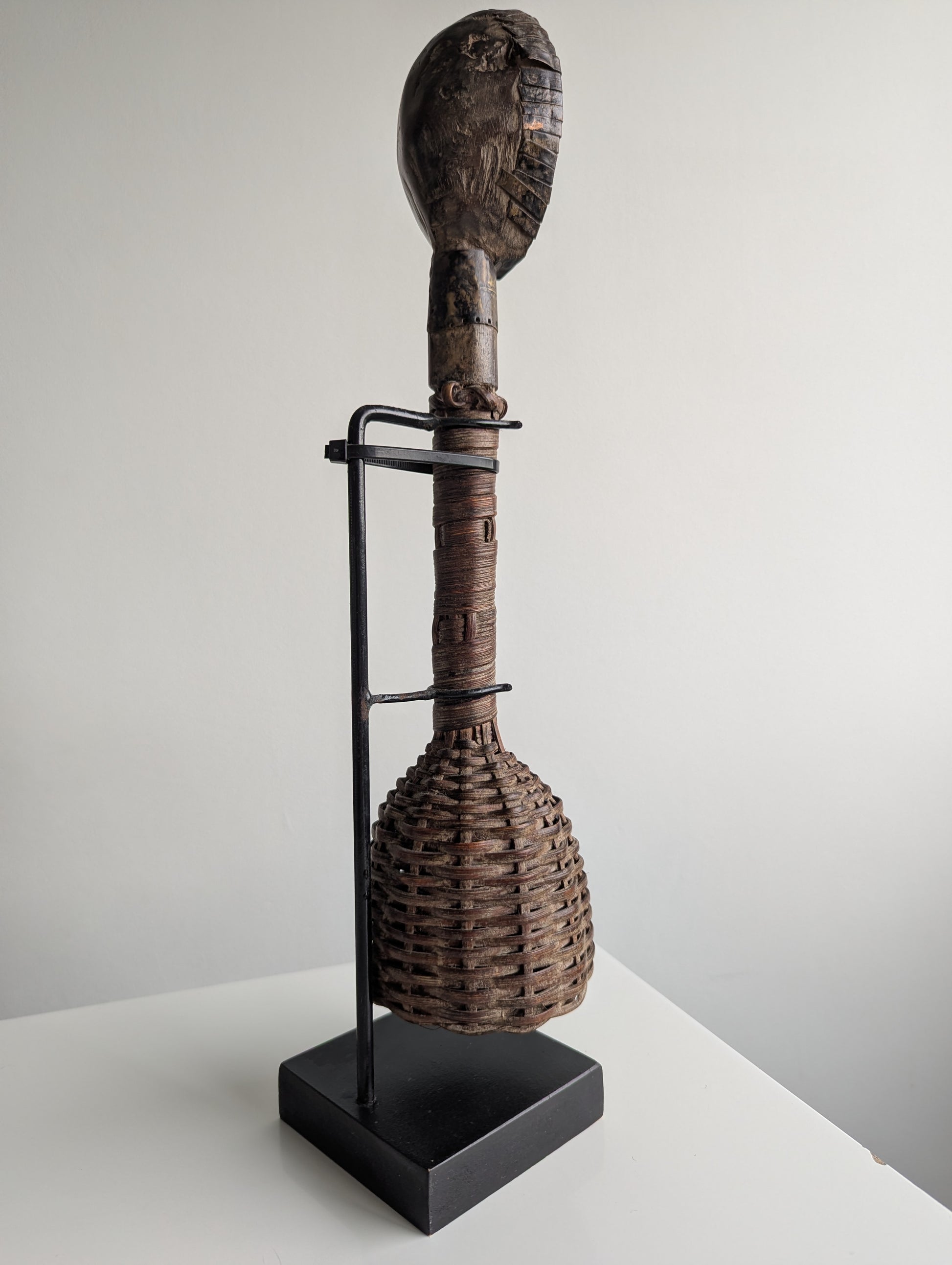 This sculptural reliquary rattle ensemble has an elongated hand grip, with the middle composed of securely bound wood strips that extend downward and flares into the lower rattle section. The seed in-cased bottom housing has been carefully crafted with a beautiful natural fiber woven binding.