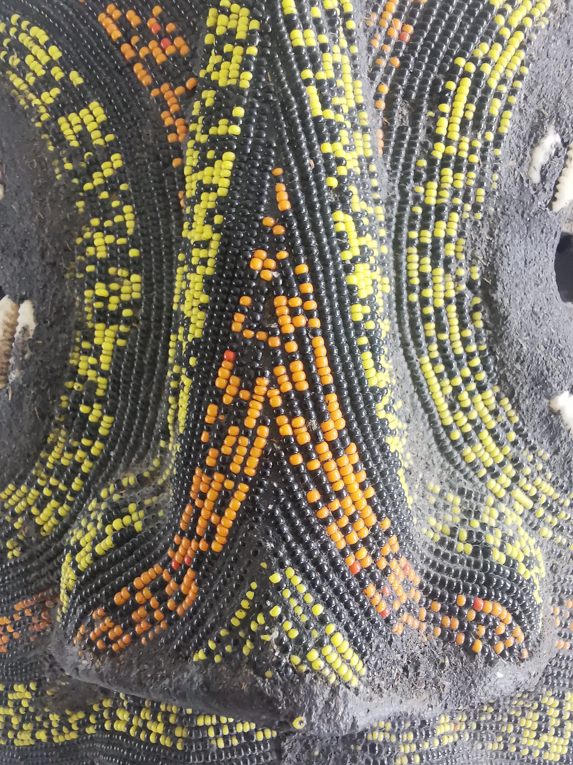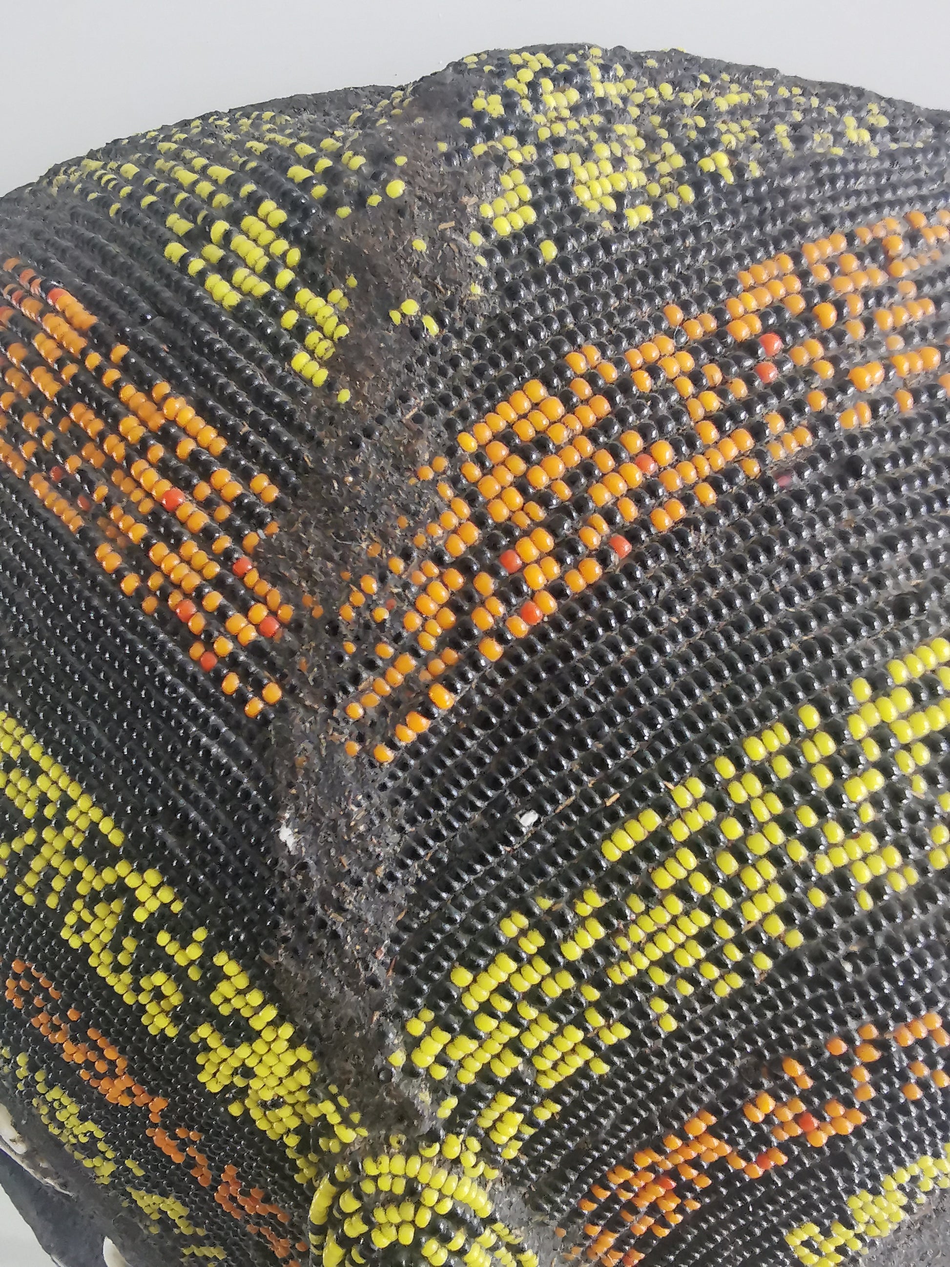 The mask, which is carved out of dark wood, is quite large and circular in shape, with brass inlay cut out eyes and guppy shaped mouth. The mask is decorated with with yellow, black and orange jigda beads and cowries.