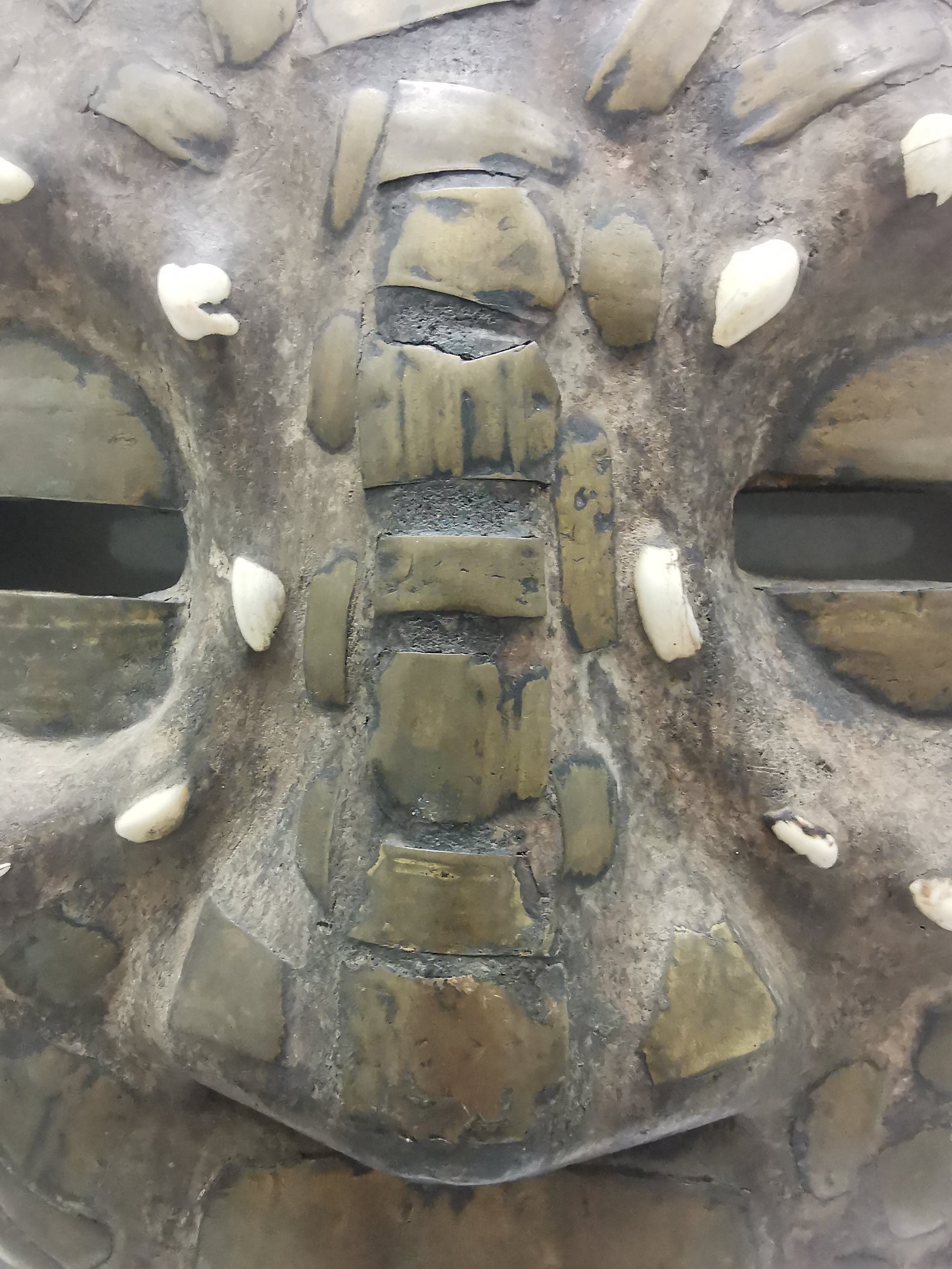 The mask, which is carved out of dark wood, is quite large and circular in shape, with cut out eyes and guppy shaped mouth. The mask is decorated with inlaid triangular pieces of copper and cowrie shells.