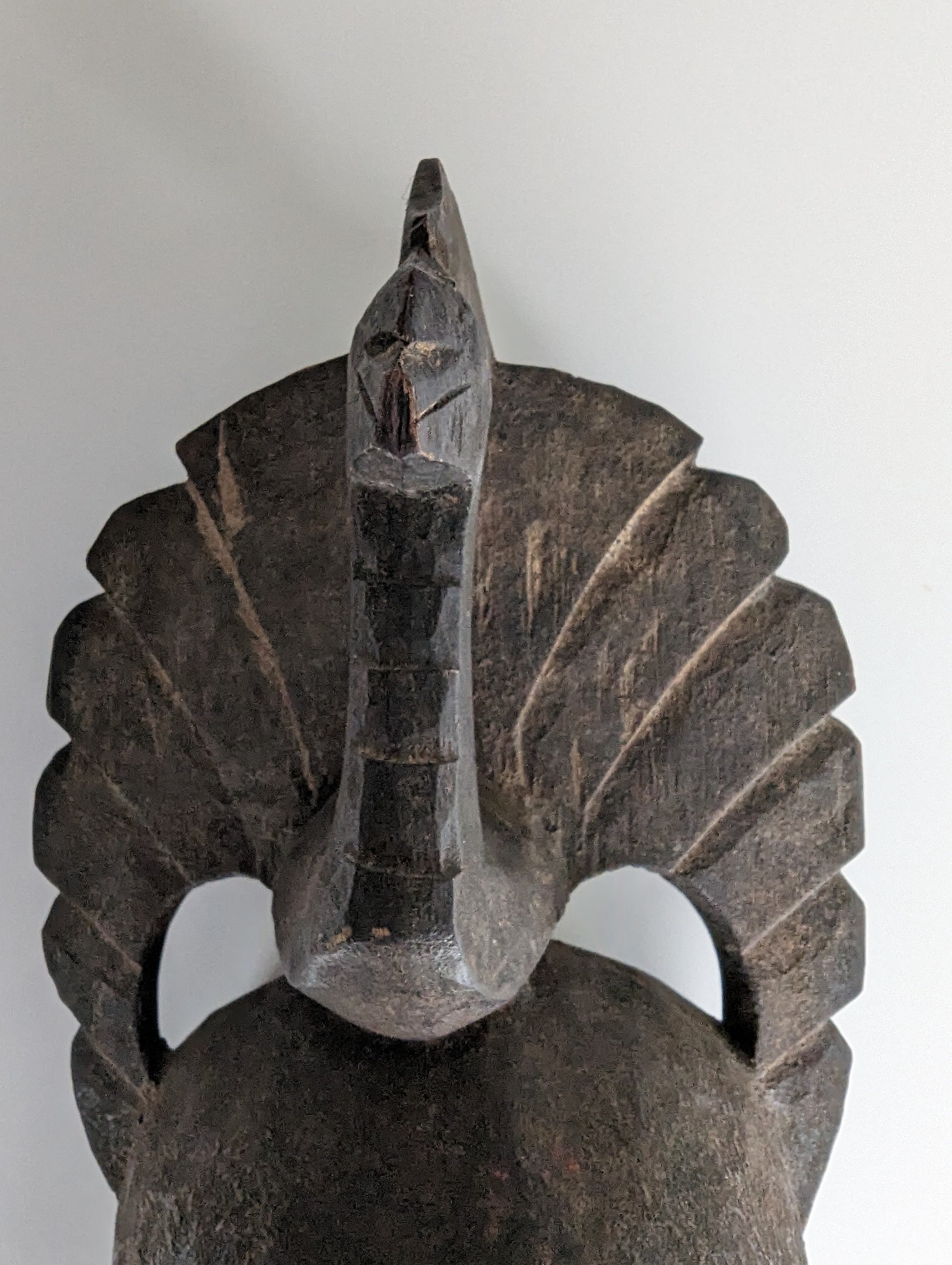 This mask of simple graphic purity is the fruit of the influence of Yaouré sculptors, west of Yamoussoukro, on the neighbouring Baoulé villages. The long thin nose, crescent shaped eyes and protruding lips are typical of these type of masks. The mask is surmounted by a simple, geometrical art-deco like bird.